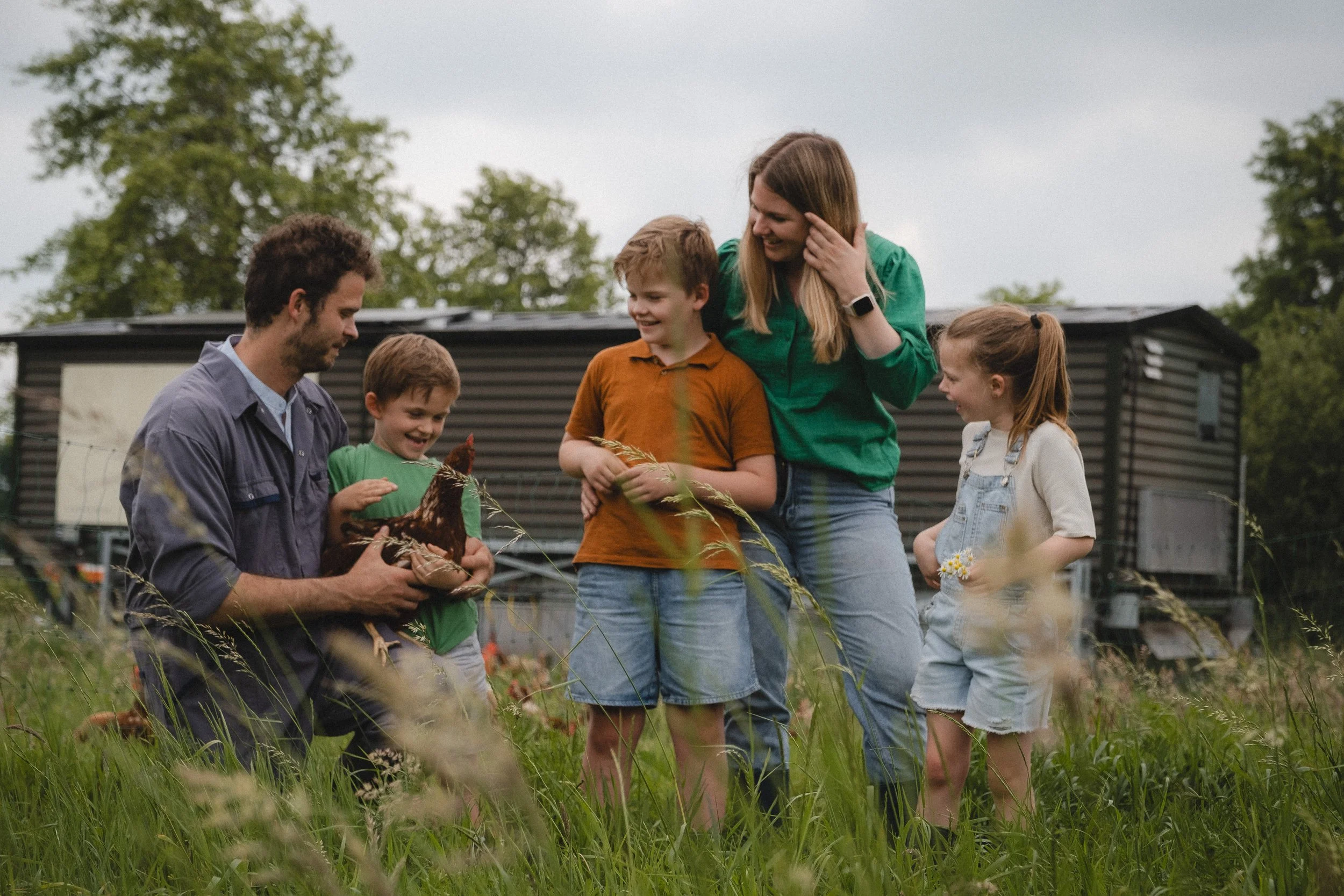 Wij zijn Jozef & Eva, een ondernemend koppel uit Maldegem/Kleit. We vonden de drukte en chaos met drie kinderen in huis in combinatie met onze jobs nét niet uitdagend genoeg en besloten vanuit onze interesses en passie een nieuw project te starten: Het Scharrelhof.